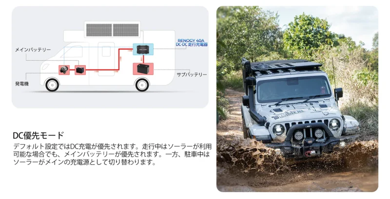 この多用途かつ洗練された走行充電器は、あらゆる場所で安定した電力供給を実現します。走行中にはDC入力に自動的に切り替わり、駐車中にはソーラー充電へとシームレスに移行します。また、SELECTボタンを押すだけでソーラー優先モードを簡単に設定でき、充電効率を最大限に引き出します。