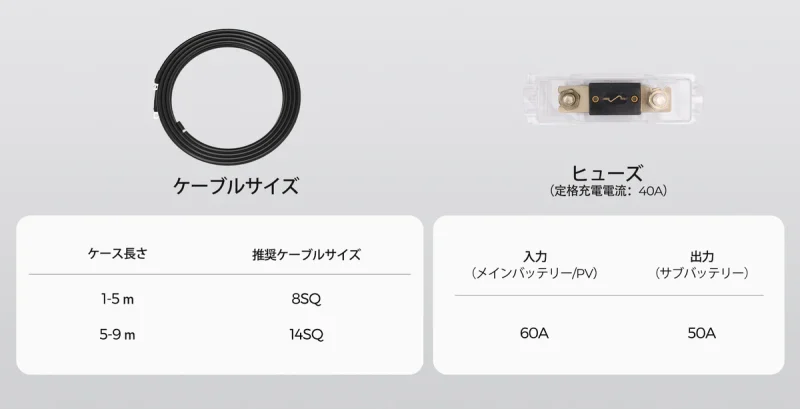 長距離のケーブル配線には、より太いゲージを使用することで、電圧降下を最小限に抑え、電力損失を減少させ、バッテリーを保護します。これにより、効率的で信頼性の高い電力転送が実現します。